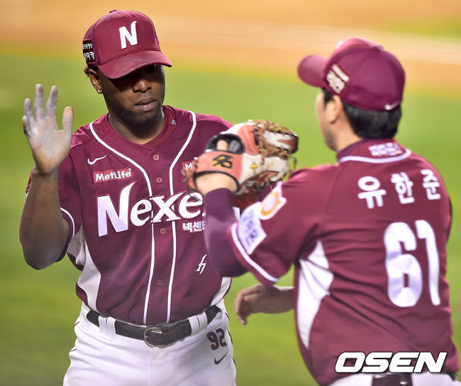 10일 오후 서울 잠실야구장에서 열린 '2014 한국야쿠르트 세븐 프로야구 포스트시즌' 삼성 라이온즈와 넥센 히어로즈의 한국시리즈 5차전, 넥센 선발투수 소사가 이닝종료 후 2,3회 연속 호수비를 펼친 유한준과 하이파이브를 하고 있다.