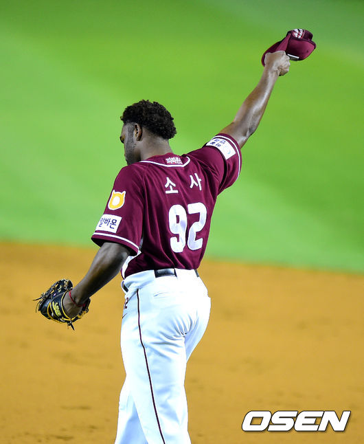10일 오후 서울 잠실야구장에서 열린 '2014 한국야쿠르트 세븐 프로야구 포스트시즌' 삼성 라이온즈와 넥센 히어로즈의 한국시리즈 5차전, 3회말 1사 1루에서 넥센 유한준이 최형우의 타구를 몸 날려 잡아내자 소사가 경의를 표하고 있다.