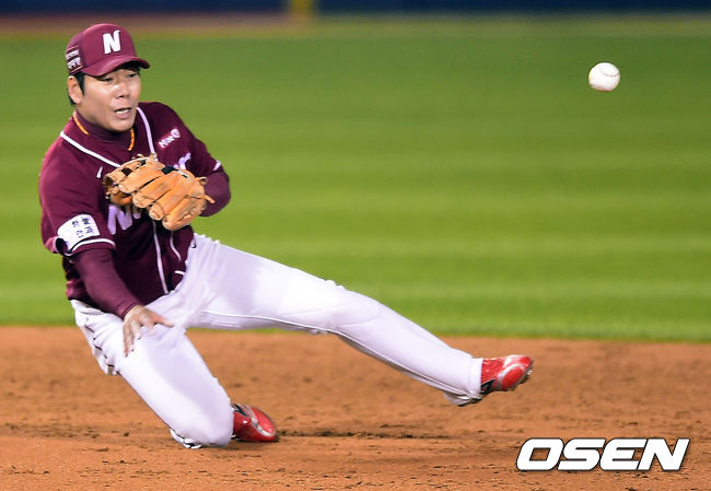 10일 오후 서울 잠실야구장에서 열린 '2014 한국야쿠르트 세븐 프로야구 포스트시즌' 삼성 라이온즈와 넥센 히어로즈의 한국시리즈 5차전, 5회말 무사 1루 삼성 나바로의 내야땅볼 타구를 넥센 강정호 유격수가 공을 놓친후 2루로 송구하고 있다.
