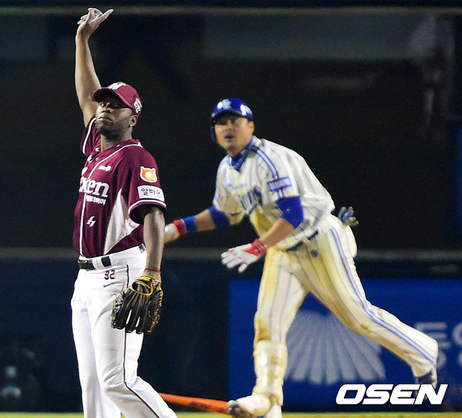 5회말 삼성 공격 1사 1루 상황 박한이의 중견수 플라이 때 넥센 선발 소사가 손가락을 높이 치켜들고 있다.