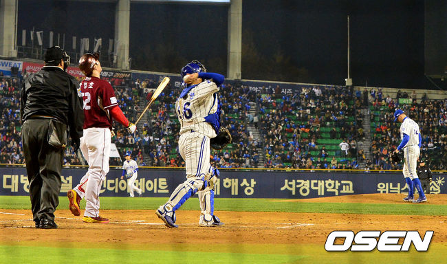 10일 오후 서울 잠실야구장에서 열린 '2014 한국야쿠르트 세븐 프로야구 포스트시즌' 삼성 라이온즈와 넥센 히어로즈의 한국시리즈 5차전, 4회초 2사에서 삼진으로 물러나는 박병호.