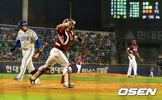 10일 오후 서울 잠실야구장에서 열린 '2014 한국야쿠르트 세븐 프로야구 포스트시즌' 삼성 라이온즈와 넥센 히어로즈의 한국시리즈 5차전, 3회말 2사 1루에서 삼성 이승엽이 삼진으로 물러나고 있다.