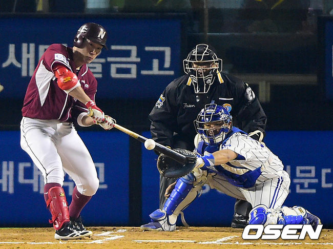 6회초 넥센 공격 1사 2루 상황 서건창이 선제 1타점 적시 우전안타를 날리고 있다.