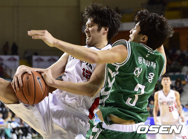 10일 오후 강원도 원주시 원주 종합체육관에서 열린 '2014-2015 KCC 프로농구' 동부 프로미와 모비스 피버스의 경기, 4쿼터 모비스 함지훈과 동부 허웅이 리바운드를 시도하고 있다.