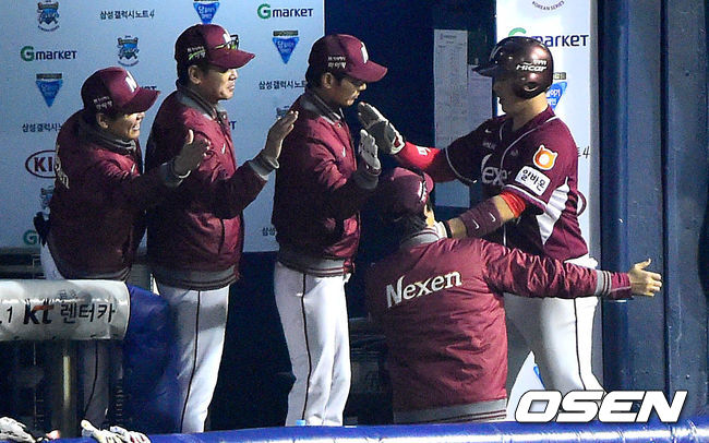 6회초 넥센 공격 1사 2루 상황 서건창의 선제 1타점 적시 우전안타 때 홈을 밟은 박헌도가 염경엽 감독과 인사를 나누고 있다.
