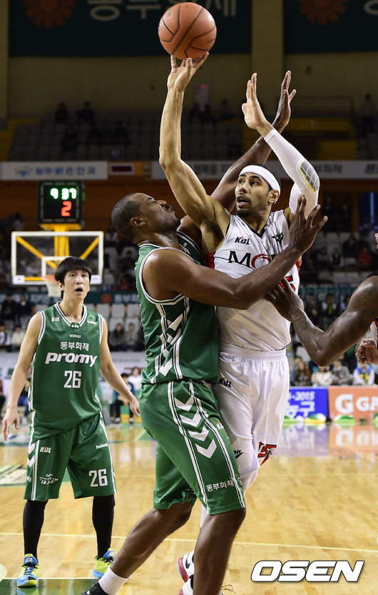 10일 오후 강원도 원주시 원주 종합체육관에서 열린 '2014-2015 KCC 프로농구' 동부 프로미와 모비스 피버스의 경기, 4쿼터 모비스 문태영이 슛을 시도하고 있다.