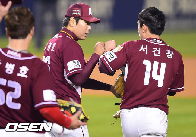 10일 오후 서울 잠실야구장에서 열린 '2014 한국야쿠르트 세븐 프로야구 포스트시즌' 삼성 라이온즈와 넥센 히어로즈의 한국시리즈 5차전,6회초 이닝종료 후 넥센 강정호가 선취 1타점 적시타를 기록한 서건창과 하이파이브를 하고 있다