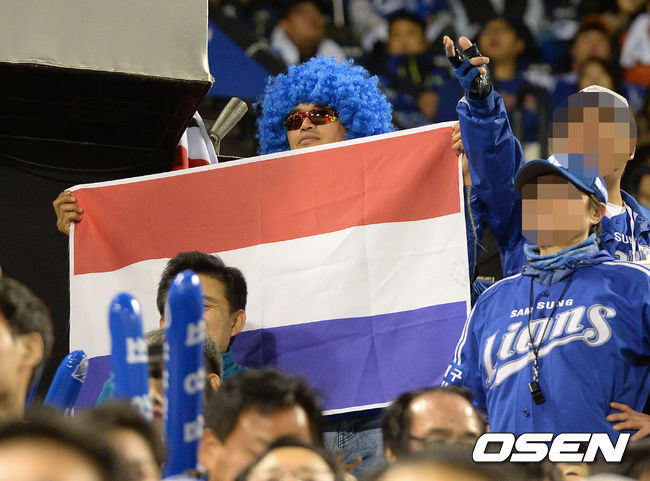 10일 오후 서울 잠실야구장에서 열린 '2014 한국야쿠르트 세븐 프로야구 포스트시즌' 삼성 라이온즈와 넥센 히어로즈의 한국시리즈 5차전, 삼성 팬들이 네덜란드 국기를 들고 밴덴헐크를 응원하고 있다.