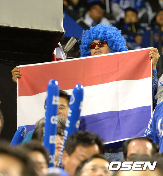 10일 오후 서울 잠실야구장에서 열린 '2014 한국야쿠르트 세븐 프로야구 포스트시즌' 삼성 라이온즈와 넥센 히어로즈의 한국시리즈 5차전, 삼성 팬들이 네덜란드 국기를 들고 밴덴헐크를 응원하고 있다.
