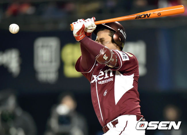 10일 오후 서울 잠실야구장에서 열린 '2014 한국야쿠르트 세븐 프로야구 포스트시즌' 삼성 라이온즈와 넥센 히어로즈의 한국시리즈 5차전, 7회초 1사 김민성이 자신의 파울타구에 얼굴을 맞고 있다.