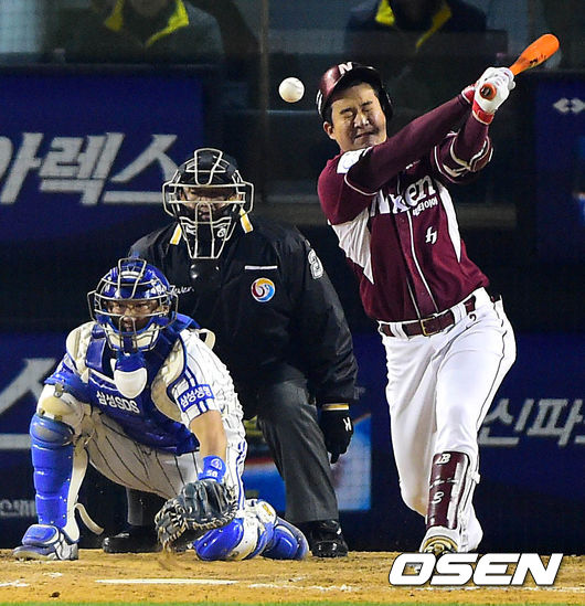 7회초 넥센 공격 1사 주자없는 상황 김민성이 자신이 친 파울타구에 헬멧을 맞고 있다.