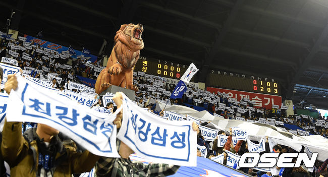 10일 오후 서울 잠실야구장에서 열린 '2014 한국야쿠르트 세븐 프로야구 포스트시즌' 삼성 라이온즈와 넥센 히어로즈의 한국시리즈 5차전, 삼성 팬들이 열띤 응원을 펼치고 있다.
