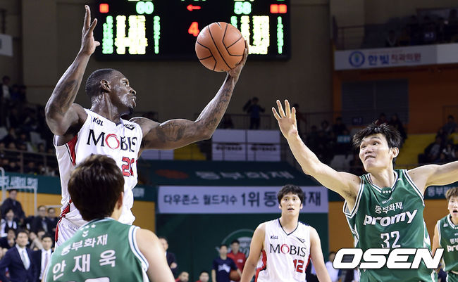 10일 오후 강원도 원주시 원주 종합체육관에서 열린 '2014-2015 KCC 프로농구' 동부 프로미와 모비스 피버스의 경기, 4쿼터 모비스 라틀리프가 리바운드에 성공하고 있다.