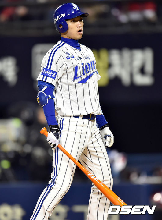 10일 오후 서울 잠실야구장에서 열린 '2014 한국야쿠르트 세븐 프로야구 포스트시즌' 삼성 라이온즈와 넥센 히어로즈의 한국시리즈 5차전, 7회말 박해민이 삼진이 선언되자 아쉬운 표정을 짓고 있다.