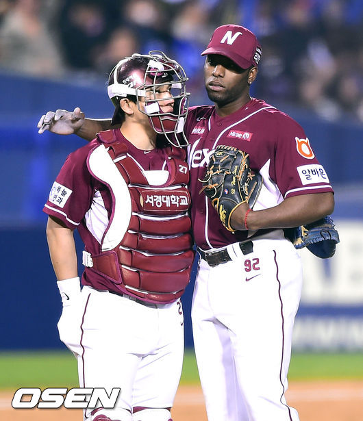 10일 오후 서울 잠실야구장에서 열린 '2014 한국야쿠르트 세븐 프로야구 포스트시즌' 삼성 라이온즈와 넥센 히어로즈의 한국시리즈 5차전,7회말 1사 1루 넥센 소사가 교체되며 박동원 포수와 어깨동무를 하고 있다.