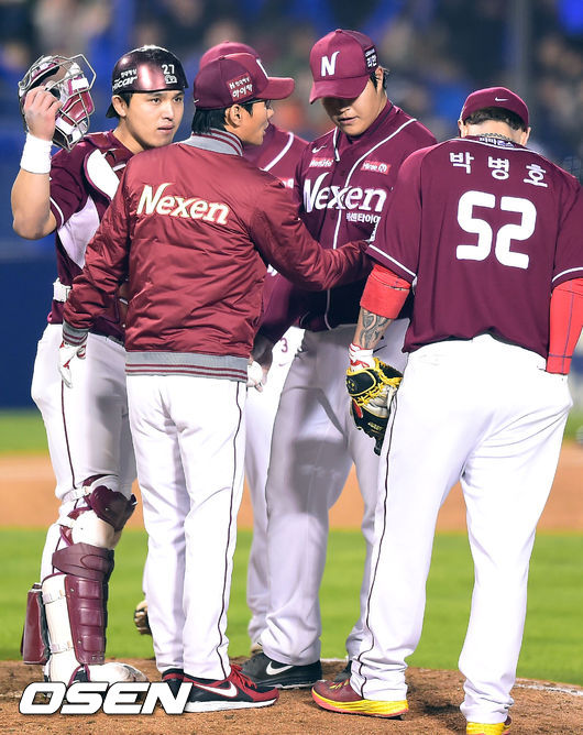 10일 오후 서울 잠실야구장에서 열린 '2014 한국야쿠르트 세븐 프로야구 포스트시즌' 삼성 라이온즈와 넥센 히어로즈의 한국시리즈 5차전,7회말 2사 1,2루 넥센 염경엽 감독이 마운드에 올라와 선수들과 이야기를 하고 있다