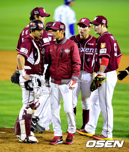 10일 오후 서울 잠실야구장에서 열린 '2014 한국야쿠르트 세븐 프로야구 포스트시즌' 삼성 라이온즈와 넥센 히어로즈의 한국시리즈 5차전, 7회말 2사 1,2루에서 넥센 염경엽 감독이 마운드에 올라 내야진과 이야기를 나누고 있다.