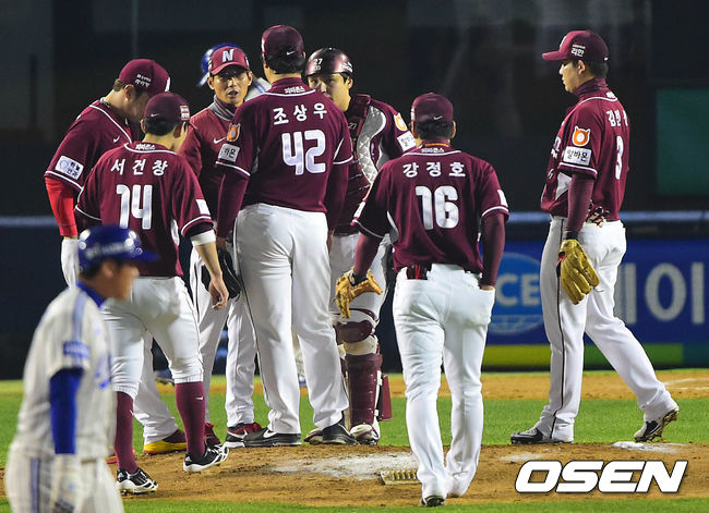 7회말 삼성 공격 2사 1, 2루 상황 넥센 염경엽 감독이 마운드에 올라 투수 조상우-포수 박동원, 내야진을 모두 불러모아 대화를 나누고 있다.