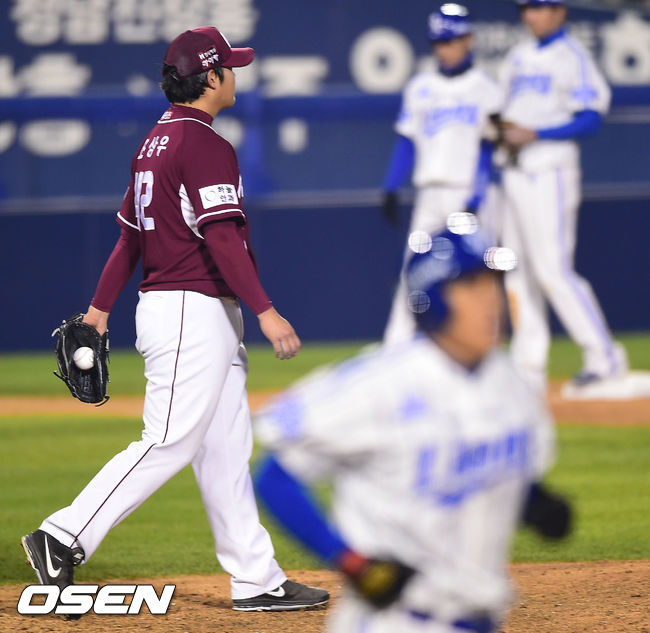 10일 오후 서울 잠실야구장에서 열린 '2014 한국야쿠르트 세븐 프로야구 포스트시즌' 삼성 라이온즈와 넥센 히어로즈의 한국시리즈 5차전,8회말 넥센 조상우 투수가 삼성 이승엽에게 몸에 맞는 공을 던진후 만루 위기를 맞이하고 있다