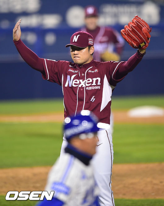 10일 오후 서울 잠실야구장에서 열린 '2014 한국야쿠르트 세븐 프로야구 포스트시즌' 삼성 라이온즈와 넥센 히어로즈의 한국시리즈 5차전,8회말 무사 만루 위기를 무실점으로 넘긴 넥센 손승락이 환호하고 있다.