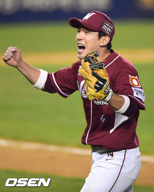 10일 오후 서울 잠실야구장에서 열린 '2014 한국야쿠르트 세븐 프로야구 포스트시즌' 삼성 라이온즈와 넥센 히어로즈의 한국시리즈 5차전,8회말 무사 만루 위기를 무실점으로 넘긴 넥센 서건창이 환호하고 있다.