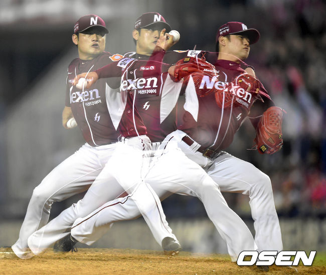 10일 오후 서울 잠실야구장에서 열린 '2014 한국야쿠르트 세븐 프로야구 포스트시즌' 삼성 라이온즈와 넥센 히어로즈의 한국시리즈 5차전, 8회말 무사 만루서 마운드에오른 손승락이 힘차게 공을 던지고 있다.