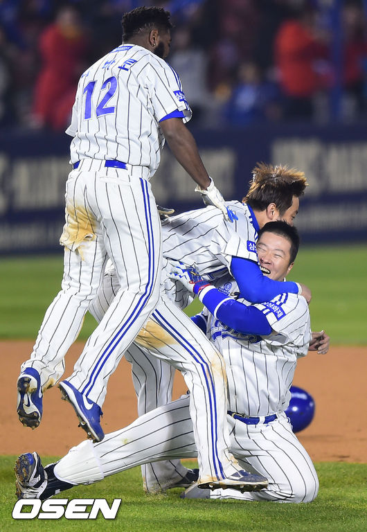 10일 오후 서울 잠실야구장에서 열린 '2014 한국야쿠르트 세븐 프로야구 포스트시즌' 삼성 라이온즈와 넥센 히어로즈의 한국시리즈 5차전,9회말 끝내기 안타를 날린 삼성 최형우가 기뻐하고 있다.