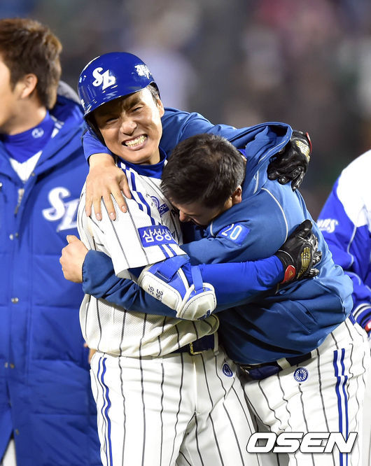 10일 오후 서울 잠실야구장에서 열린 '2014 한국야쿠르트 세븐 프로야구 포스트시즌' 삼성 라이온즈와 넥센 히어로즈의 한국시리즈 5차전, 9회말 2사 1,3루 최형우가 끝내기 안타를 치자 이승엽이 진갑용과 포옹을 하며 기쁨을 나누고 있다.