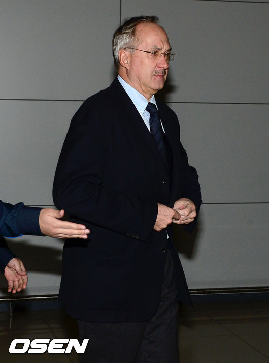 출국에 앞서 슈틸리케 감독이 기자회견 장소로 들어서고 있다.