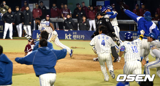 10일 오후 서울 잠실야구장에서 열린 '2014 한국야쿠르트 세븐 프로야구 포스트시즌' 삼성 라이온즈와 넥센 히어로즈의 한국시리즈 5차전, 9회말 최형우의 끝내기 안타때 삼성 선수들이 그라운드로 나와 환호하고 있다.