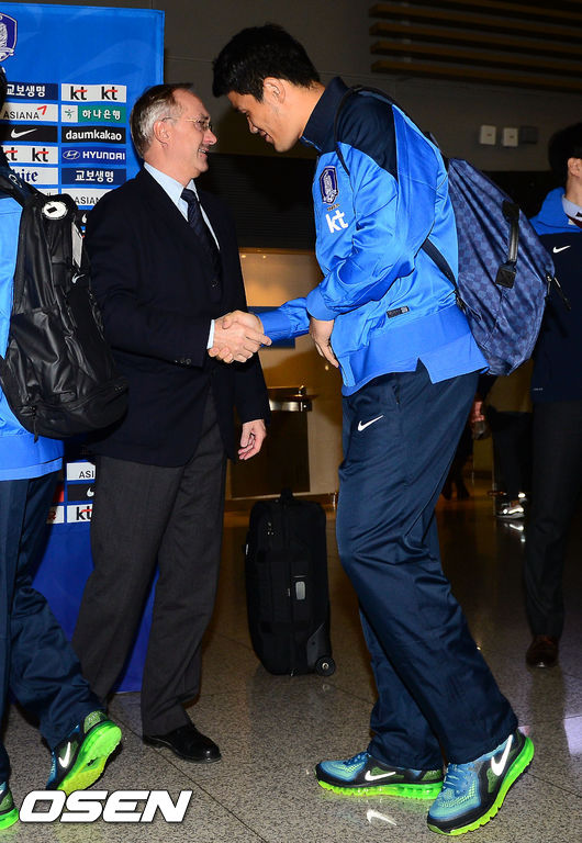 출국에 앞서 슈틸리케 감독이 정성룡과 악수를 나누고 있다.