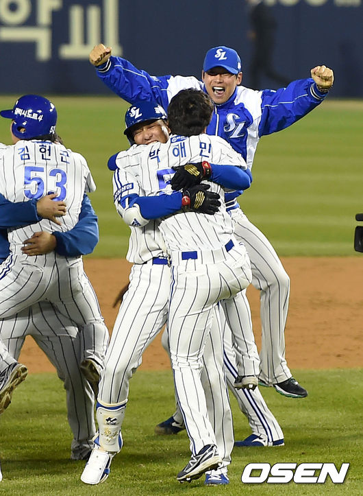 10일 오후 서울 잠실야구장에서 열린 '2014 한국야쿠르트 세븐 프로야구 포스트시즌' 삼성 라이온즈와 넥센 히어로즈의 한국시리즈 5차전, 9회말 최형우의 끝내기 안타때 삼성 선수들이 그라운드로 나와 환호하고 있다.