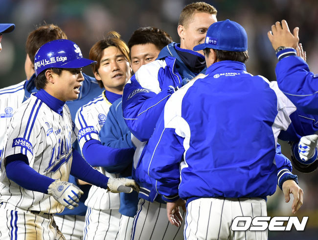 10일 오후 서울 잠실야구장에서 열린 '2014 한국야쿠르트 세븐 프로야구 포스트시즌' 삼성 라이온즈와 넥센 히어로즈의 한국시리즈 5차전, 9회말 2사 1,3루 최형우가 끝내기 안타를 치자 류중일 감독이달려나와 기뻐하고 있다.