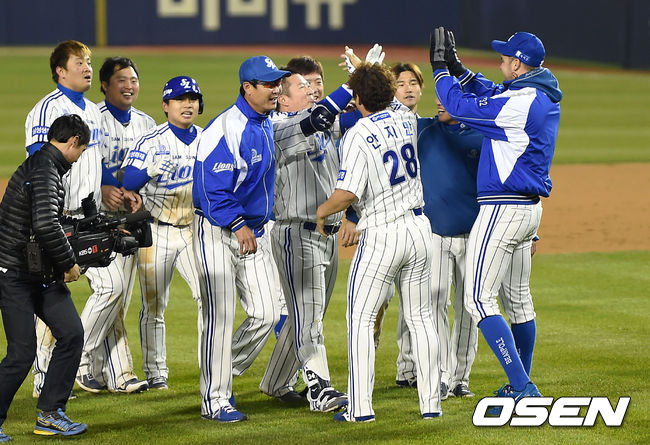 10일 오후 서울 잠실야구장에서 열린 '2014 한국야쿠르트 세븐 프로야구 포스트시즌' 삼성 라이온즈와 넥센 히어로즈의 한국시리즈 5차전, 9회말 끝내기 안타를 친 삼성 최형우가 동료들과 환호하고 있다.