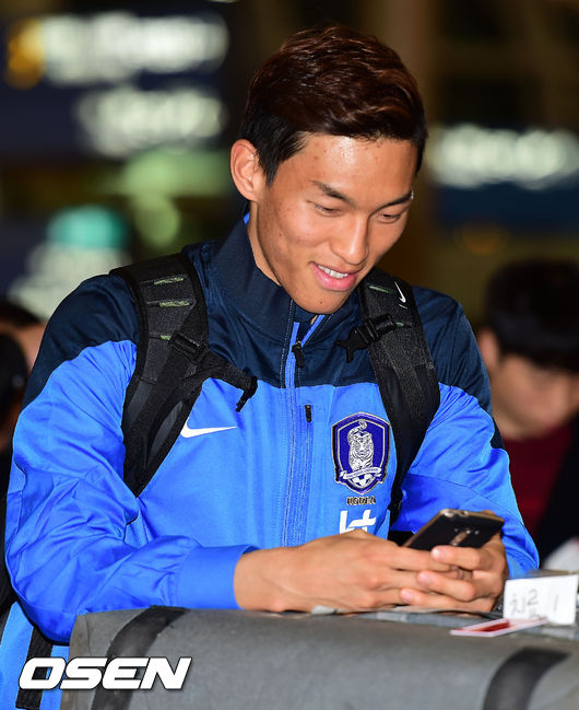 출국에 앞서 짐을 붙히던 김승규가 핸드폰을 만지고 있다.