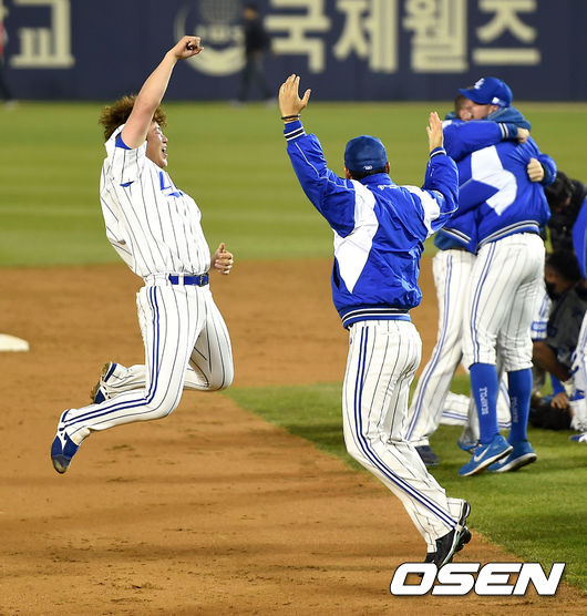 10일 오후 서울 잠실야구장에서 열린 '2014 한국야쿠르트 세븐 프로야구 포스트시즌' 삼성 라이온즈와 넥센 히어로즈의 한국시리즈 5차전, 9회말 최형우의 끝내기 안타때 삼성 선수들이 그라운드로 나와 환호하고 있다.