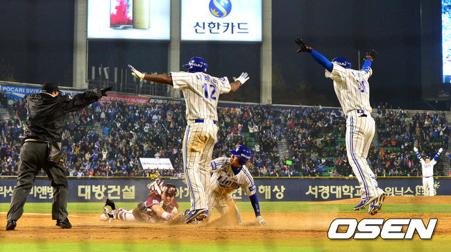 9회말 2사 1,3루에서 삼성 최형우의 끝내기 2루타에 김헌곤이 홈에서 세이프되고 있다./jpnews@osen.co.kr