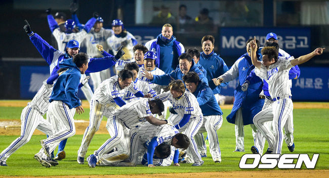 9회말 삼성 공격 2사 1, 3루 상황 최형우가 넥센 투수 손승락을 상대로 끝내기 2루타를 날리고동료들의 거친 축하를 받고 있다./dreamer@osen.co.kr