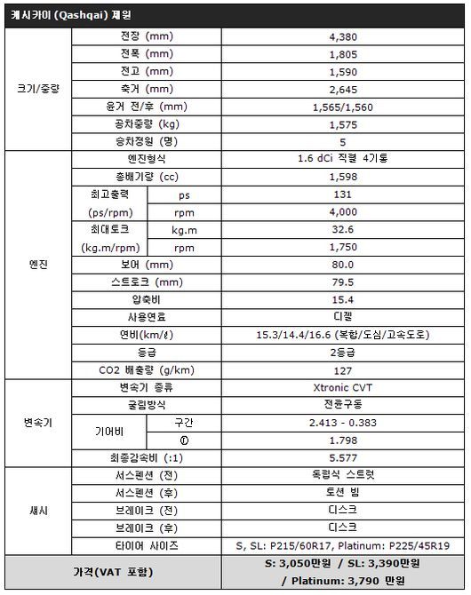 캐시카이는 최고출력 131/4000(ps/rpm), 최대토크 32.6/1750(kg.m/rpm)의 1.6리터 디젤 엔진과 7단 매뉴얼 모드를 지원하는 엑스트로닉 CVT(Xtronic CVT) 무단 변속기를 탑재했다. 이를 통해 세련되고 매끄러운 주행성능은 물론, 공인연비 15.3km/ℓ(도심 14.4km/ℓ, 고속도로 16.6km/ℓ)의 탁월한 효율성까지 확보했다. 특히 낮은 RPM 영역에서부터 최대토크를 발휘해 중?저속 구간이 많은 한국의 도심 환경에 최적화 됐다는 평가다.