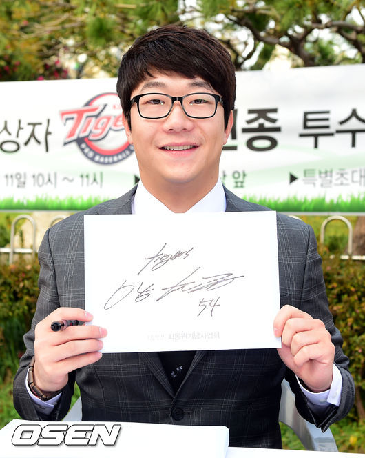 첫번째 수상자로 선정된 기자 타이거즈의 양현종이 사인과 함께 포토타임을 하고 있다.