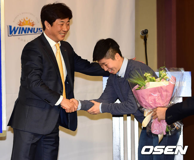 11일 오전 서울 여의도동 63컨벤션센터에서 열린 2015 WKBL 신입선수 선발회에서 1라운드 전체 1순위로 KDB생명에 지명된 안혜지가 안세환 감독과 악수를 나누고 있다.