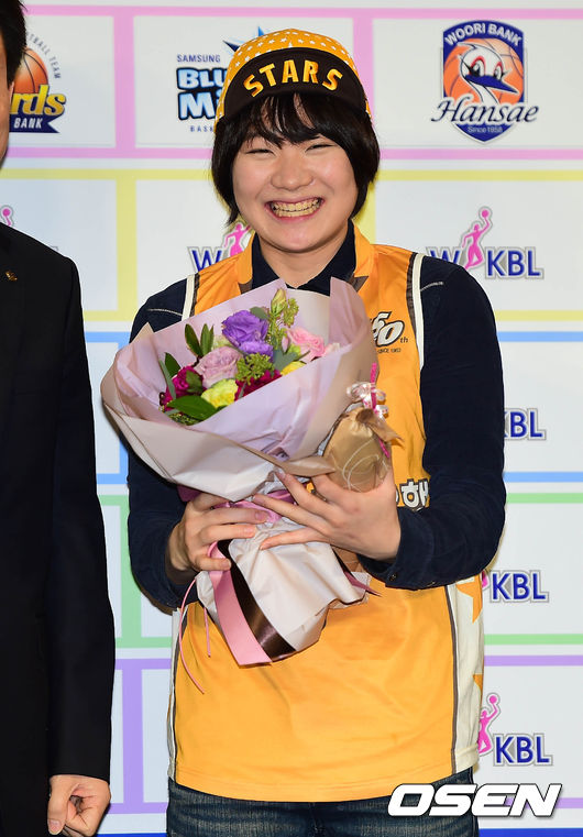 11일 오전 서울 여의도동 63컨벤션센터에서 열린 2015 WKBL 신입선수 선발회에서 1라운드 2순위로 KB국민은행에 지명된 김진영이 미소를 짓고 있다.