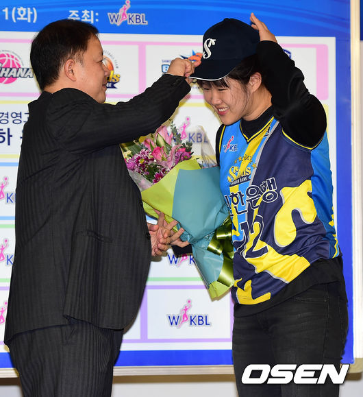 11일 오전 서울 여의도동 63컨벤션센터에서 열린 2015 WKBL 신입선수 선발회에서 1라운드 신한은행에 지명된 김연희가 유니폼을 입고 있다.