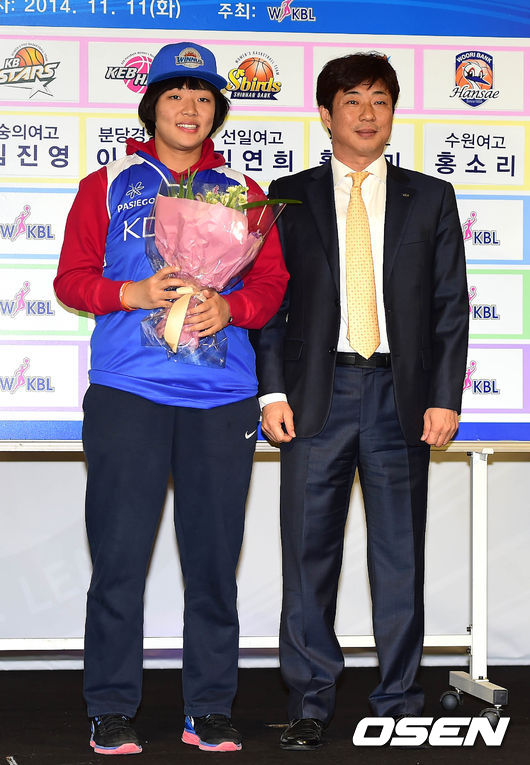 11일 오전 서울 여의도동 63컨벤션센터에서 열린 2015 WKBL 신입선수 선발회에서 1라운드 KDB생명에 지명된 홍소리가 안세환 감독과 기념촬영을 하고 있다.