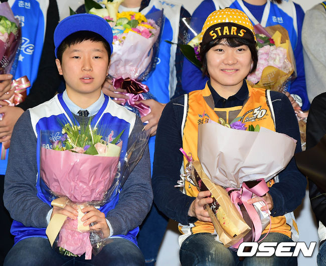 11일 오전 서울 여의도동 63컨벤션센터에서 열린 2015 WKBL 신입선수 선발회에서 1라운드 1순위 안혜지(왼쪽)와 2순위 김진영이 기념촬영을 하고 있다.