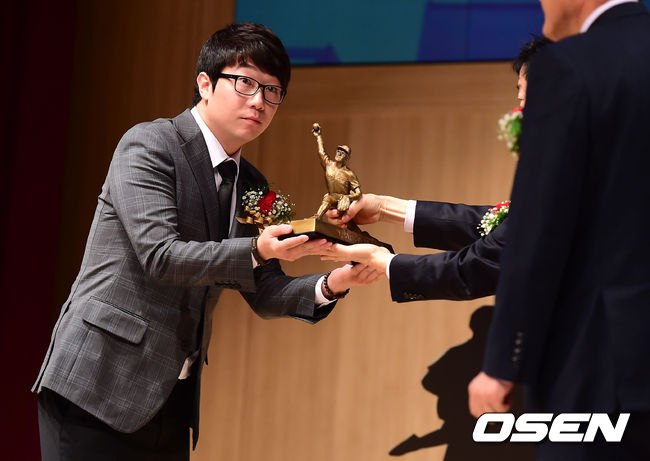 기아 양현종이 제1회 무쇠팔 최동원상을 수상하고 있다.