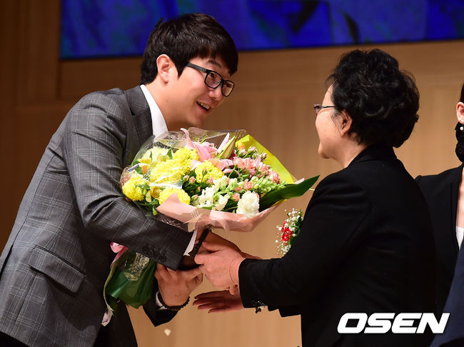 제1회 무쇠팔 최동원상을 수상한 기아 양현종이 김정자 여사로부터 꽃다발을 전달받고 있다.