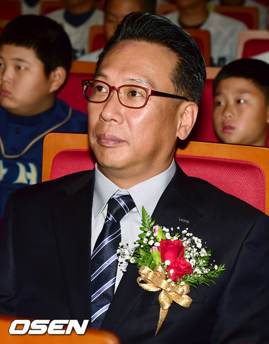 이윤원 롯데 단장이 양현종의 수상 소감을 듣고 있다.