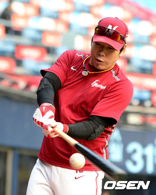 11일 오후 서울 잠실야구장에서 열린 '2014 한국야쿠르트 세븐 프로야구 포스트시즌' 삼성 라이온즈와 넥센 히어로즈의 한국시리즈 6차전, 경기에 앞서 넥센 강정호가 배팅 훈련을 하고 있다.