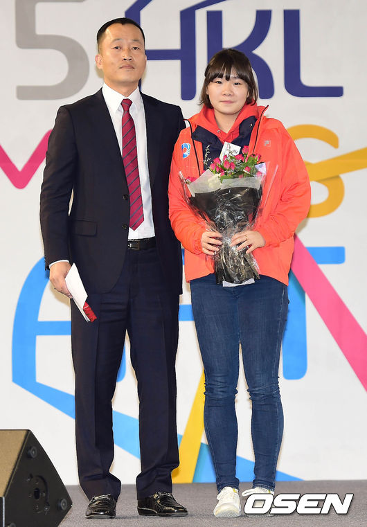 11일 오후 서울 송파구 방이동 SK핸드볼경기장 보조구장에서 열린 2015 여자실업핸드볼 신인드래프트에서 1라운드 인천에 지명된 송지은이 기념촬영을 하고 있다.